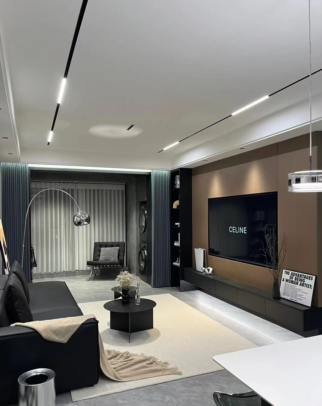 客厅现代简约偏黑暗风格,适合年轻人住,舒适流行,能同时接待4~5个客人。