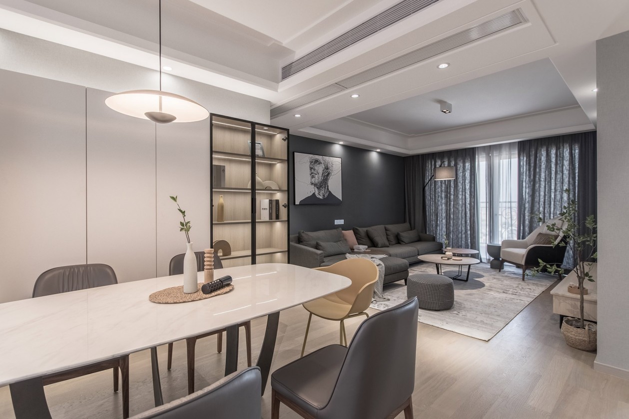 将摩登气质刻入整体基调 从面到体,阐述纯色之美 使跳色与细纹 唤活了客厅的生活仪式感