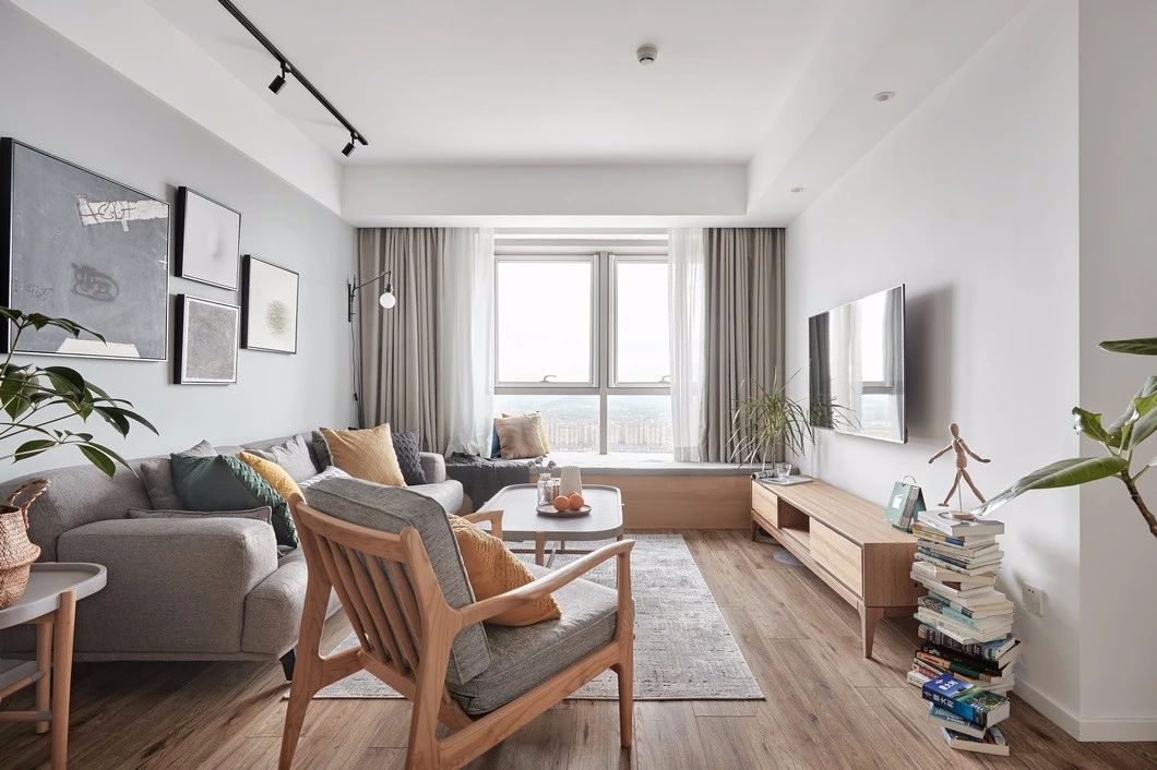 夹边套的客厅朝向偏北,采光不是特别好,因此客厅的设计重点是明亮。轨道灯代替主灯,搭配大飘窗和色调轻浅的家具,轻盈不失温馨。