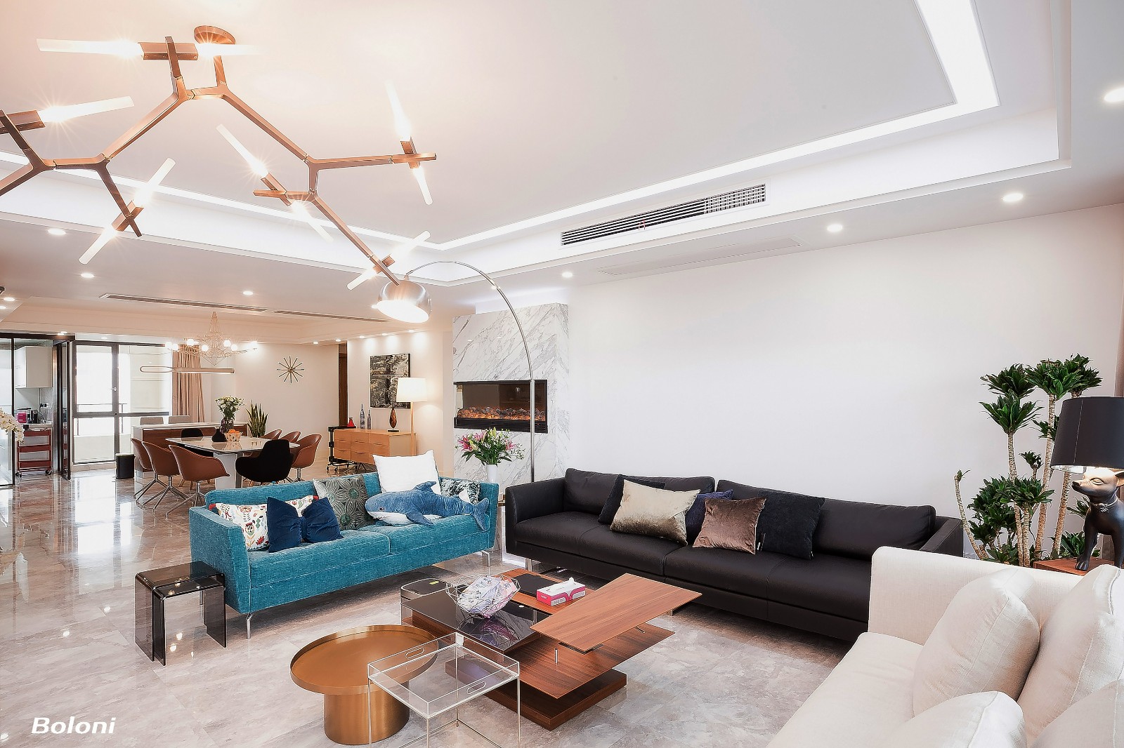 白色墙面干净大气,蓝绿色沙发,成为空间色彩的一抹点睛之笔,深色沙发通过抱枕实现跳色的组合让空间更加活泼。