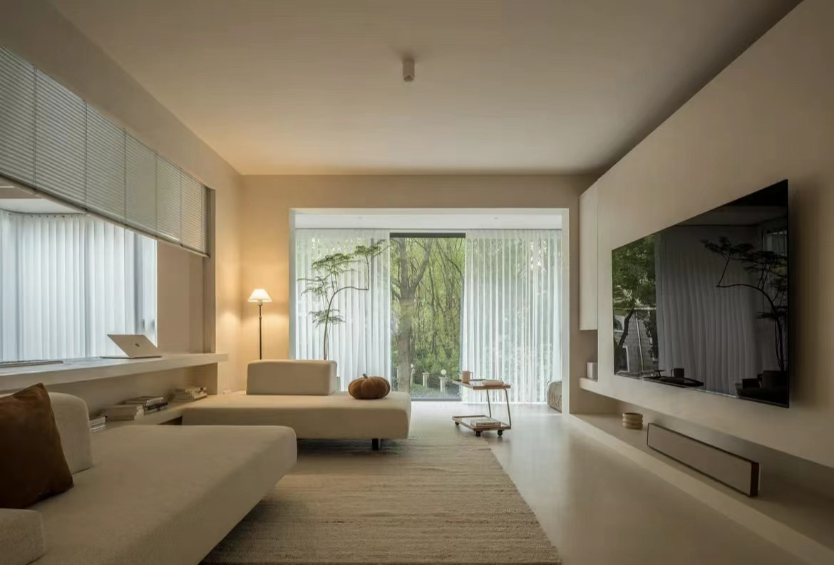 业主房屋位于二层,被绿植环绕包裹,加之屋主喜好极简千净的空问氛国,所以将空问整体基调定为温和米色调,采用墙、顶、地一体的设计,打造被温暖和纯净的氛国包裹的柔和空问,辅以窗外野性自然的绿意,呈现出一种返璞归真般质朴古拙的韵味。