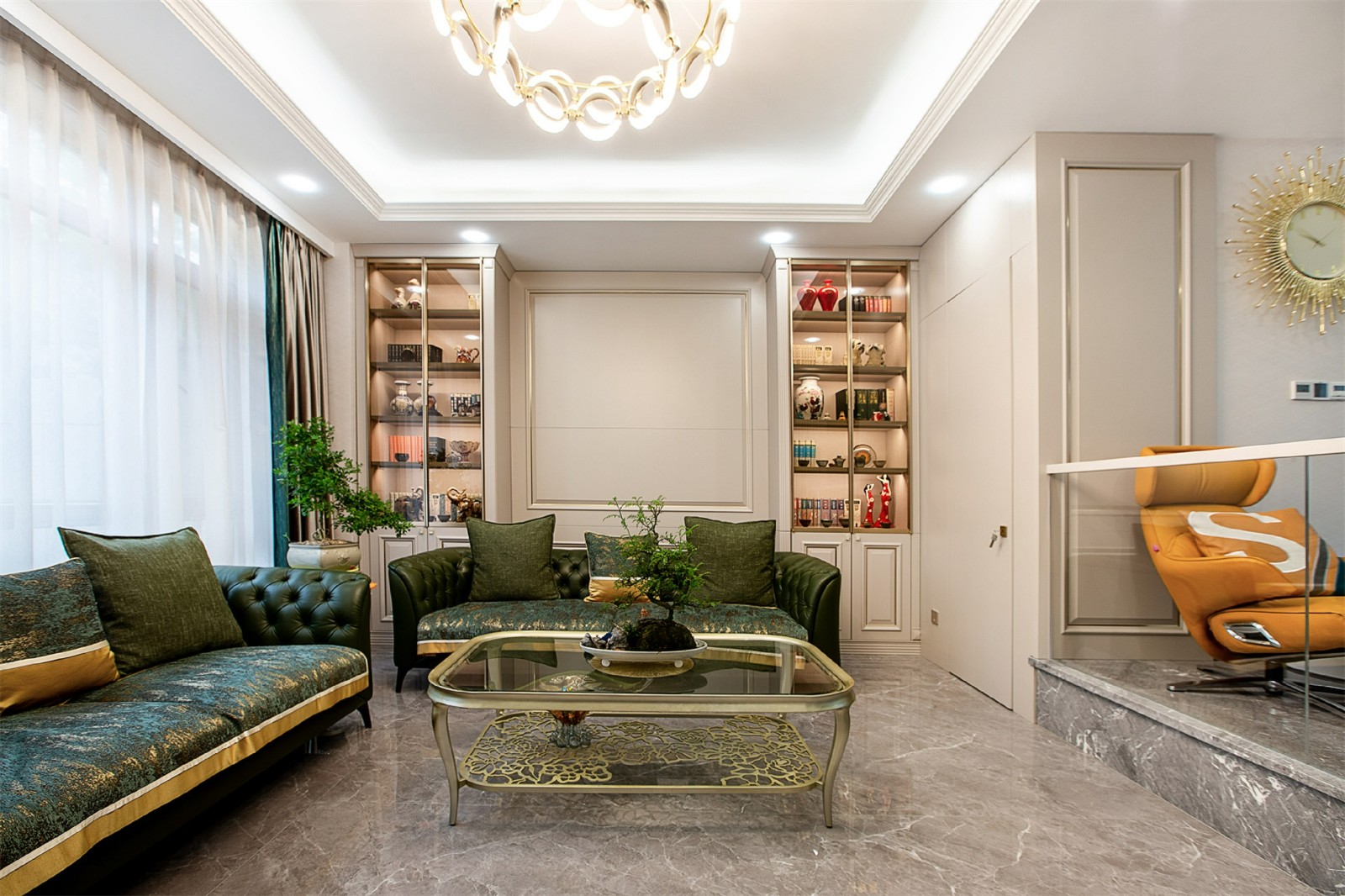 翡翠绿色的沙发搭配灰色花纹的地板,奢华又不失质感。