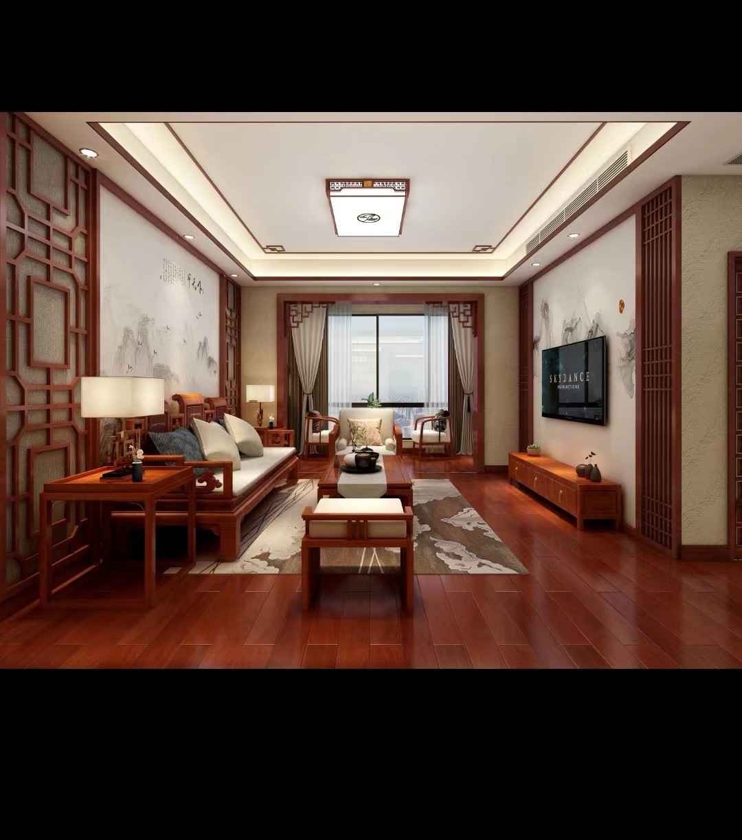 本案为中式别墅设计,整体家居和木制作为红木色
