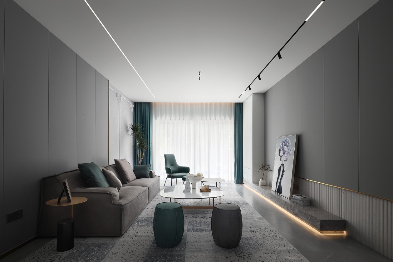 以***灰为底色,摆置与面贴合、与色统一的体块,形成对望呼应的造景意趣。选用复古雅致的绿调,强化转折面的独立性与关联性,以发散点缀的手法拓展排布序列,满足休憩、会客等多场景需求。