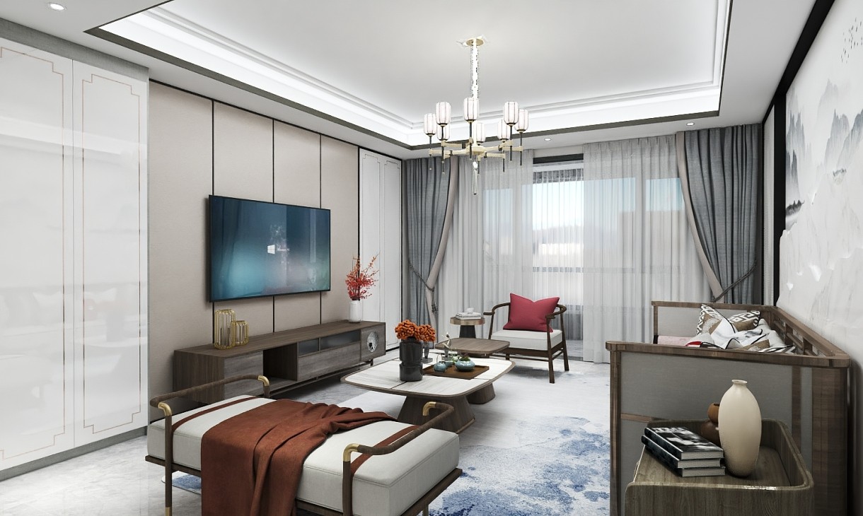 本案以浅灰为基础色调,深色线条勾勒点缀,构成新中式格调的居住环境。亮面的部分墙板和柜门质感以及少量的金属质感来体现现代时尚气息。少量彩色软装饰品点缀。