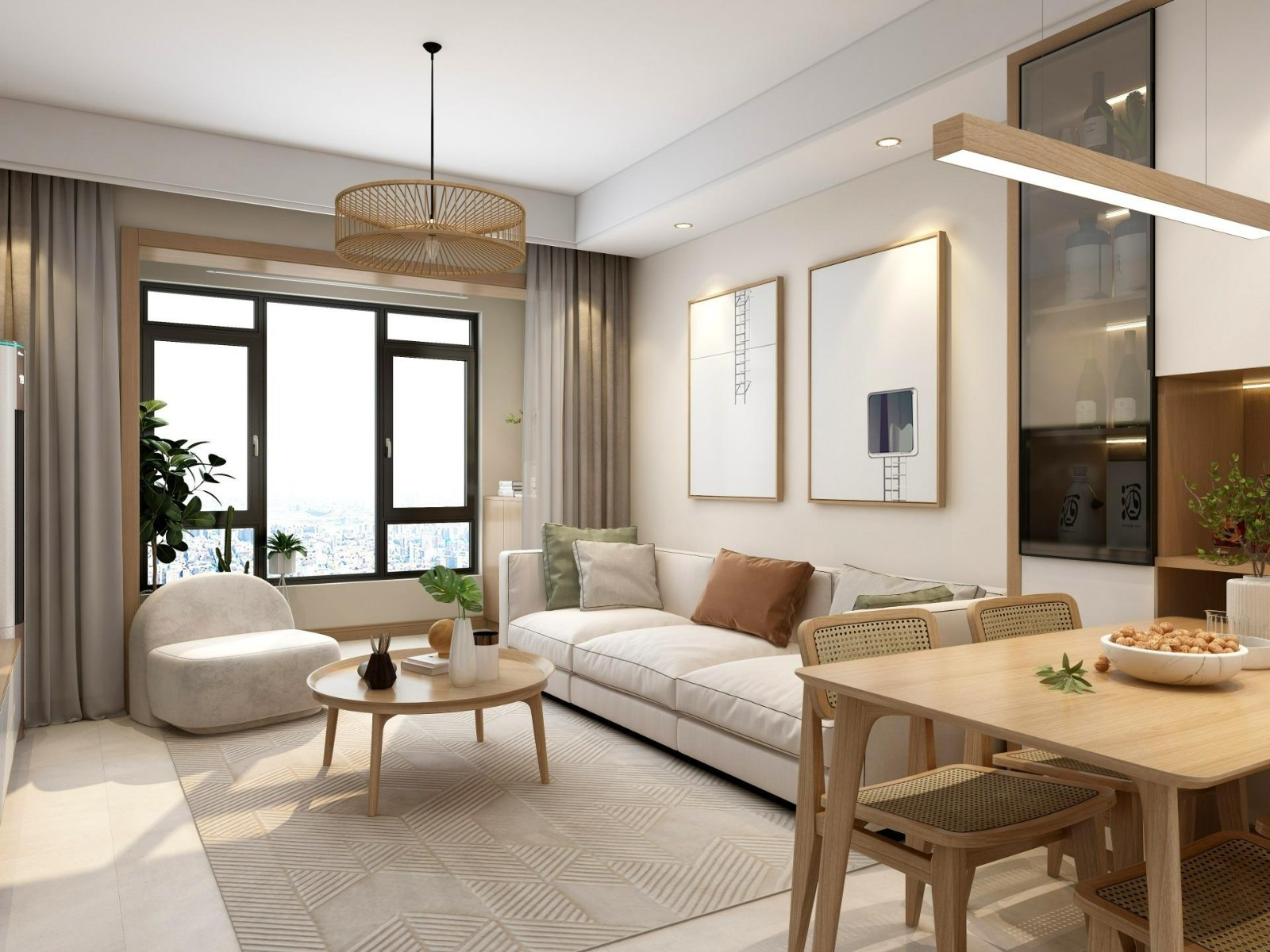 奶白色布艺沙发搭配原木风家具,整体现代感十足。