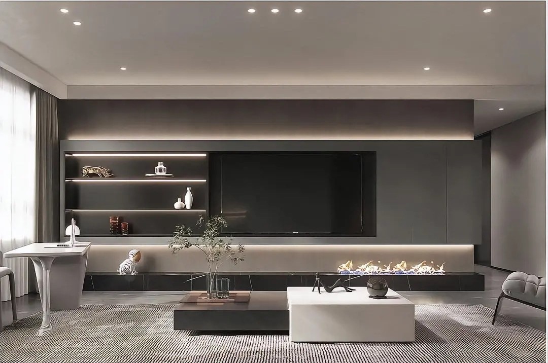 全屋采用冷色系,黑白灰色系相互结合,营造出现代简约的氛围,背景墙采用地台加悬空背景墙,增加空间活跃性,无主灯点缀,光线明暗分明,增加空间层次感。