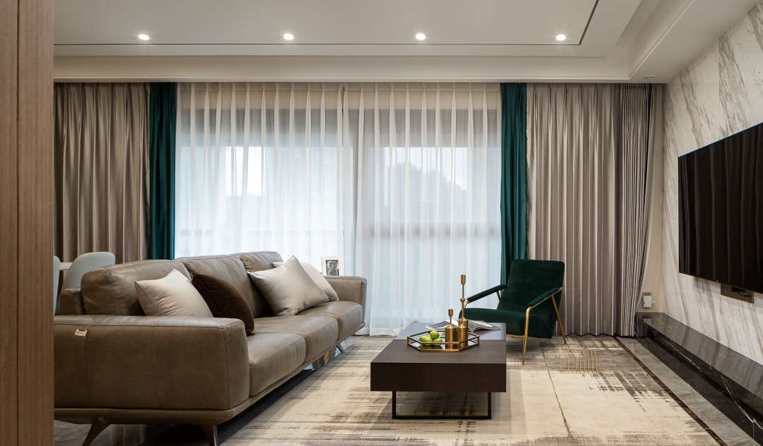 中性而又低奢的金属材质一直伴随着现代轻奢的主旋律而存在,地面利用做旧式的地毯来体现空间的时尚感与温度,使得客厅多了一份惬意。