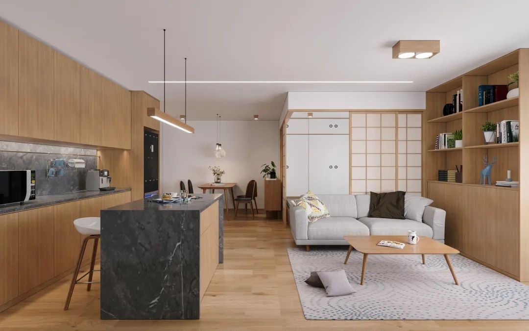 在这套近100平米的房子中,整体空间以木地板+大白墙的空间,营造出一种简约原木风的气息,通过布置灰色调的舒适软装,以独特的空间格局设计