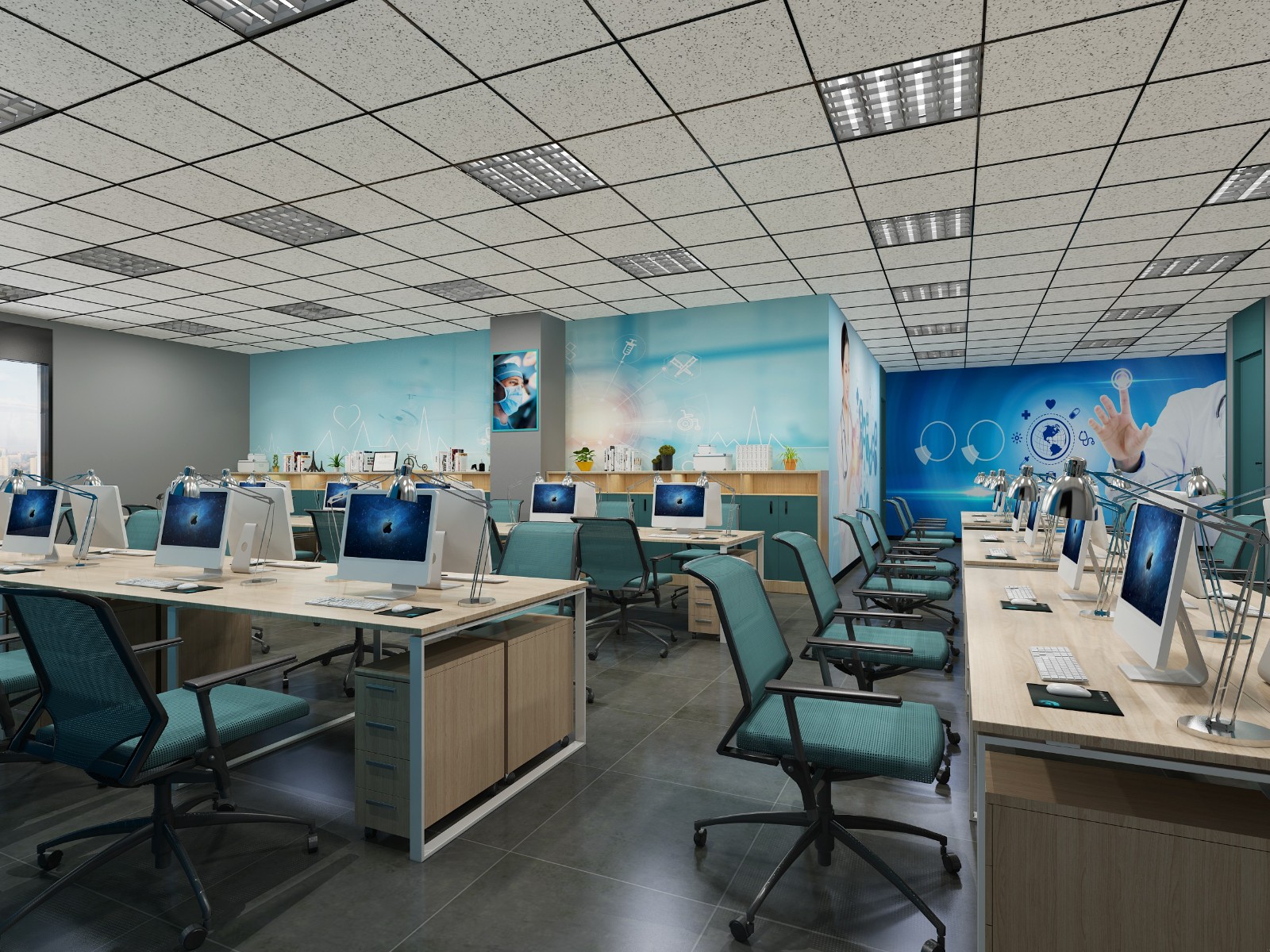 分四层装修,每层套内面积约1000平方。功能划分:一层前台、接待室及多功能会议室;二层员工办公区;三层医疗及研究中心;四层实验室及领导办公室。装修风格:以现代简约为主。