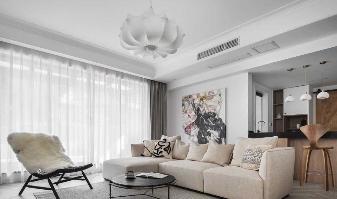 客厅的配色是干净纯粹的,花朵形状的灯具也给人一种纯白圣洁的感觉。