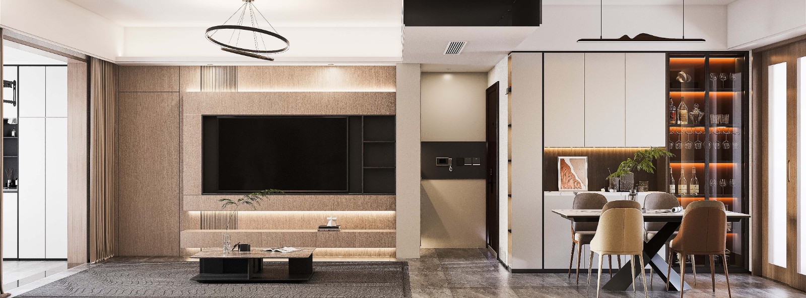 沙发背景墙奶咖色木饰面搭配木饰面,营造出安静舒适的生活格调