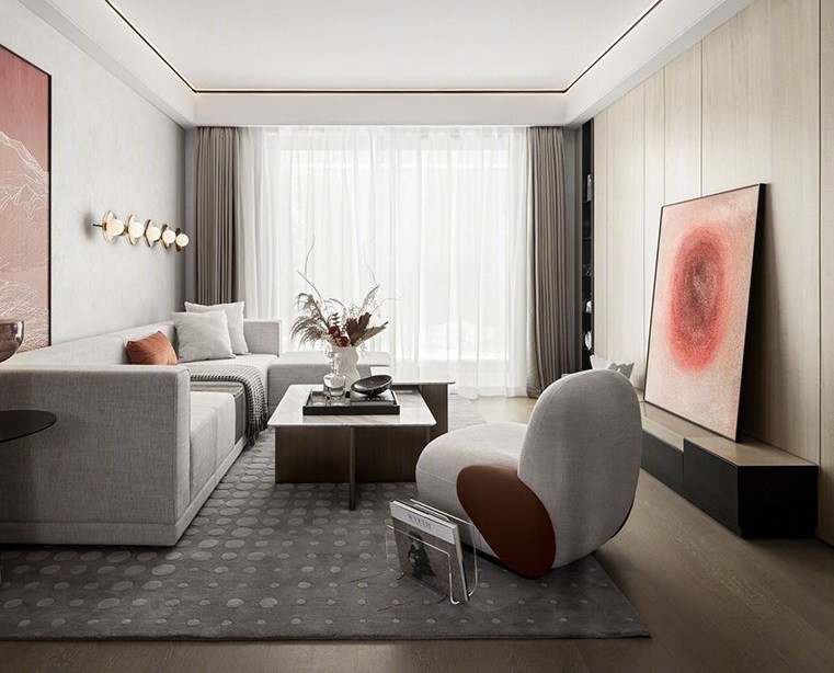 客厅以橘红色作为点缀跃然眼前。灰白色调所呈现出的沉稳宁静,被橘红色的温暖融解,成为可触摸、感知的柔软。