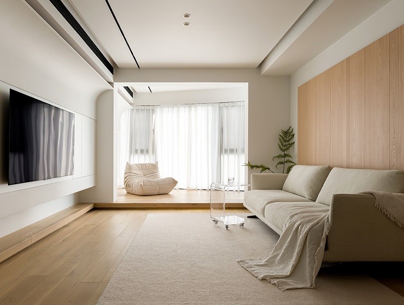 阳台纳入室内,增加客厅面积的同时延展了视觉的舒适性,原木饰面流露着温润氛围,配合着奶油色系的家居让色彩感更一致。