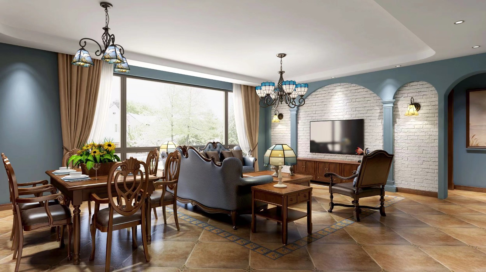 地中海风格,全屋色调蓝色与木色为主,搭配白色,家具同样采用蓝色木色系列。此图片为完工实景