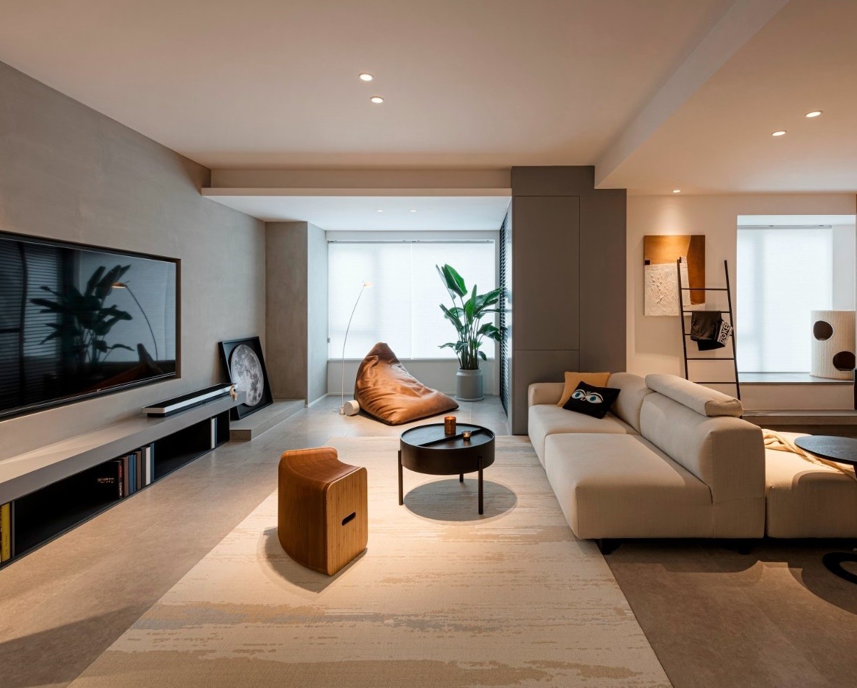 打通主阳台,分割出一个洗衣间和一块休息区,利用灵动组合的家具模式,组成三区合一的互动空间,营造界而未界的情感体验。以原木饰面作装饰,配合柔软的沙发家具,辅以柔和的灯光烘托,围合出两人一猫的互动场域,营造平静且温馨的氛围感。