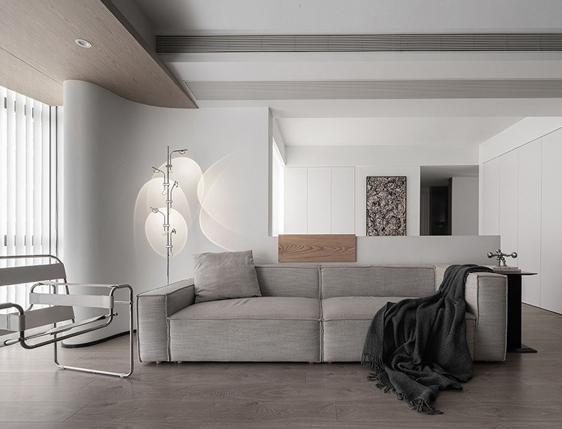 看向客厅,通透开阔的视觉效果,一眼纵览整个公共区域的全貌。白色与浅灰色柔和交融,搭配局部原木色的点缀,冷静中多了一丝的温柔,不需要多余的家具和装饰,尽可能留给孩子多一些活动区域。