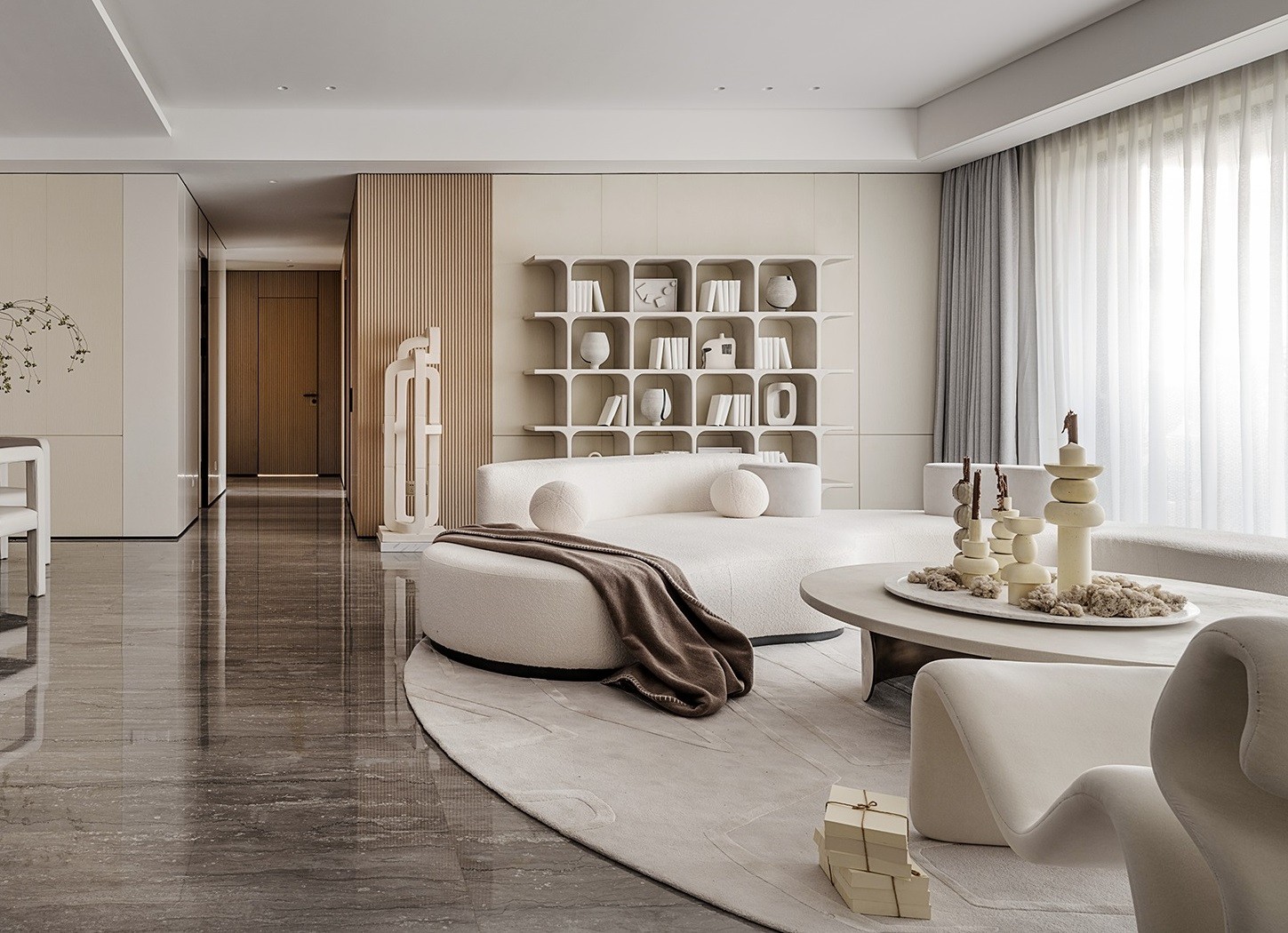 整体空间色彩层次上,设计师采用不同情绪质感的“白”去呈现微妙生动的渐变,诸如奶白、米白色、砂岩白等不同色泽的调和均衡,令视觉感到松弛舒适。软装形态语言在找寻硬装设计结构之上,加以提炼延伸,家居形态也多为不规则、曲线形,呈现自由、无边界的空间性格。