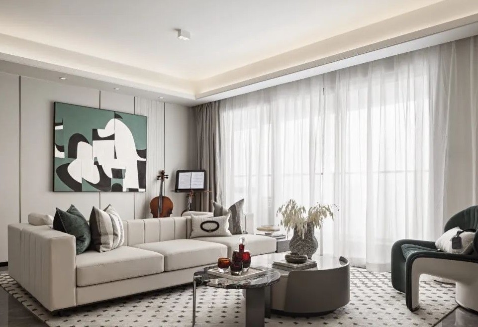 客厅——闲暇时邀上志同道合的朋友小聚,畅谈。以男主人收藏爱好且适合用于展示性的氛围,运用电影与音乐主题结合的方式,加上精致奢华的家具灯具,让空间极具品质。