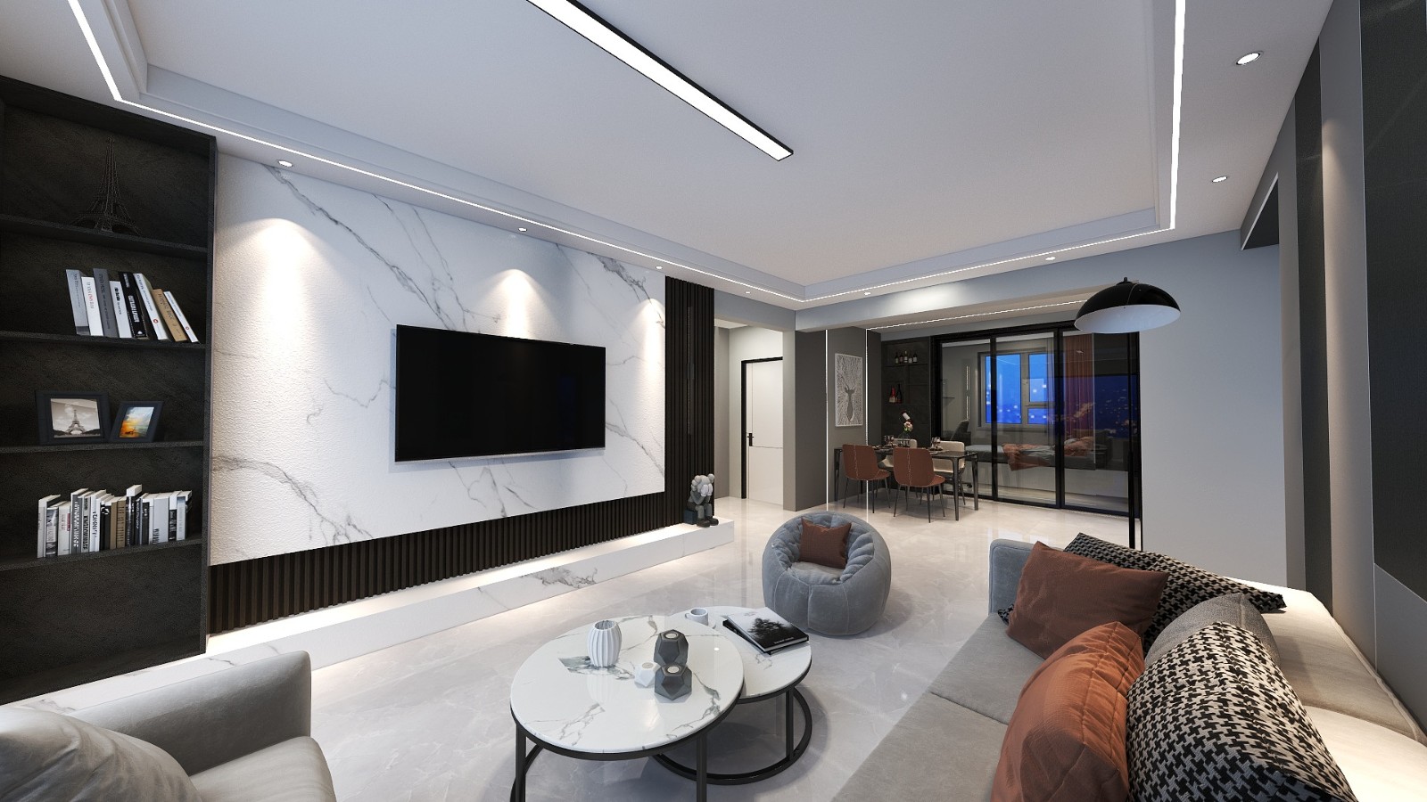 电视背景墙采用岩板格栅板,悬浮背景墙。一侧放有展示柜。此图片为完工实景。