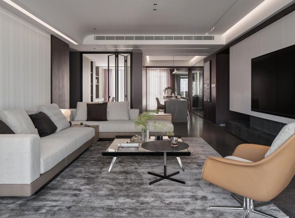 车马不到,尘嚣不扰,觅得一方闲暇时光,静守内心隐秘的窃喜,倚窗观雨、临轩听风,通透且拉伸客厅景深效果。大理石、皮具、布艺、艺术岩板……各种材质的碰撞,让文化与空间更好交融。