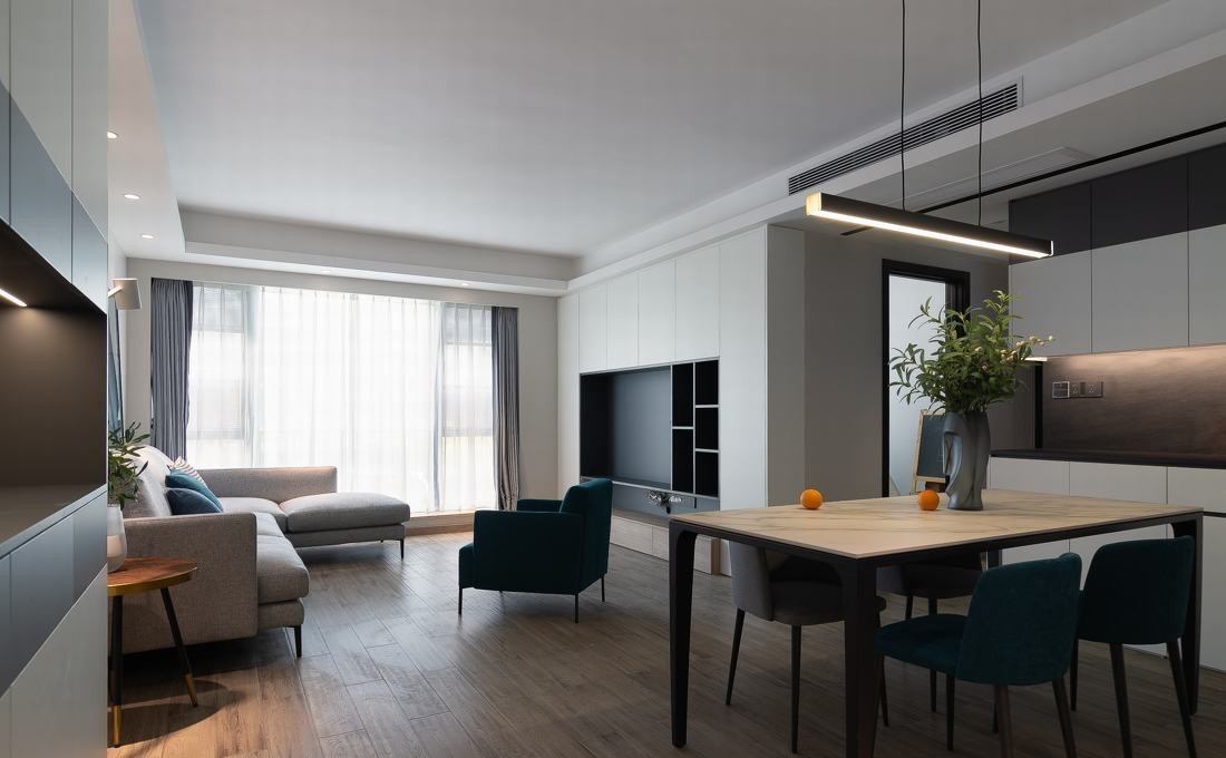 为了保证通透的空间效果,客餐厅采用了无主灯的设计,吊顶也尽可能的简单化,合理搭配筒灯、线性灯,避免繁复,让整个空间更加规整简洁,空间层次更加丰富,简单中又能看出特别之处。