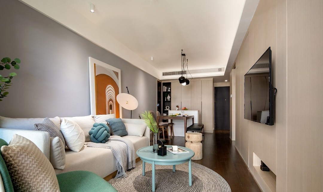 客厅清浅的灰色调搭配如橙色 果绿色 雾霾蓝 湖蓝色等软装,给人清爽干净的感觉。