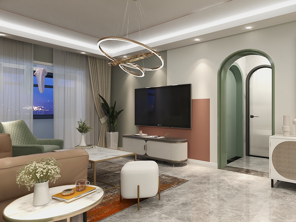客厅随着优雅的石膏线条铺开,又用牛油果绿配合拱形门,增加法式的氛围