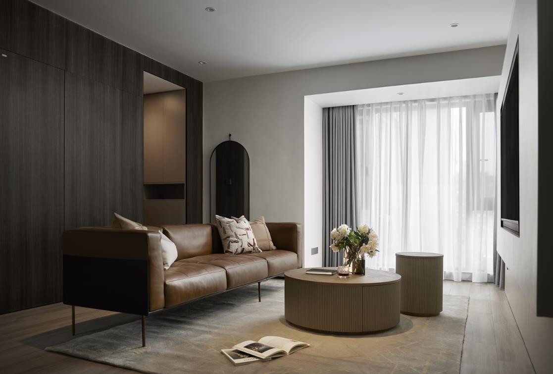 客餐厅一体的格局,开阔通透,极具纵深感,给人带来视觉上的放松。深色木质墙面,为空间奠定了沉稳克制、自然温润的基调。