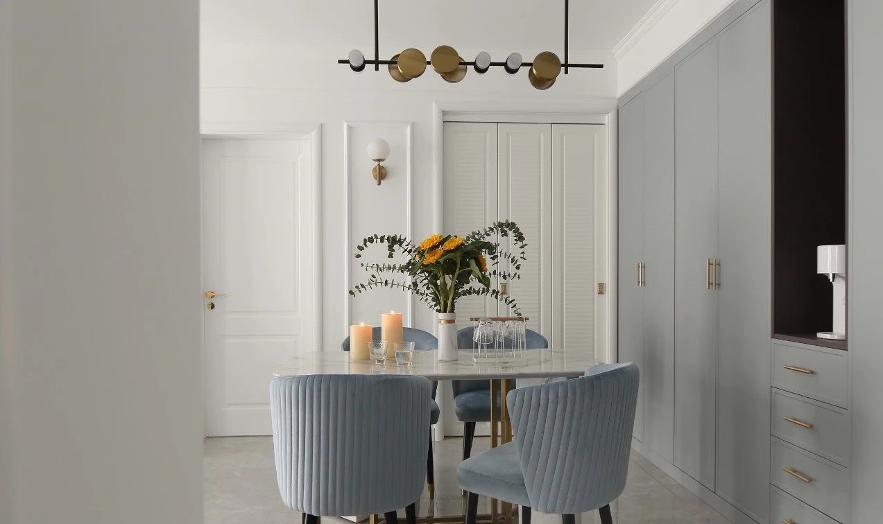 客餐厅全景,大面积白色的墙顶面,没有过多的装饰造型,干净利落的空间加入复古优雅的家具软饰和低调轻奢的色彩氛围,提升空间的精致干练和纯粹美感