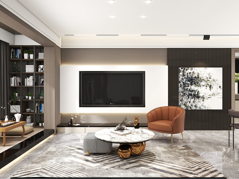 业主喜欢大气轻奢、现代有质感的设计风格,故设计师以沉稳的冷色***灰为主色调,搭配一些岩板、金属的元素和铜质金属来打造出现代轻奢感。