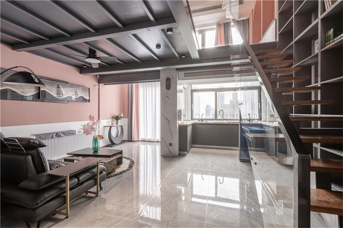 本屋户型方正,南北通透,身为LOFT,也有其个性特点,主要的设计点在于:(1)空间材质的应用,主要以顶面的钢结构和钢材为基调,除地板不论,都尽量用到类似金属、玻璃和石材这种偏冷硬的材料,以构建更好的空间感;(2)尽可能做开放式空间,可以解决LOFT很大的采光及通风问题,可以让空间感看起来更大,提升呈现效果;(3)立体构成的设计,因为有足够的空高,设计能不拘泥于平面,可以通过楼梯及配套设计(开放式通