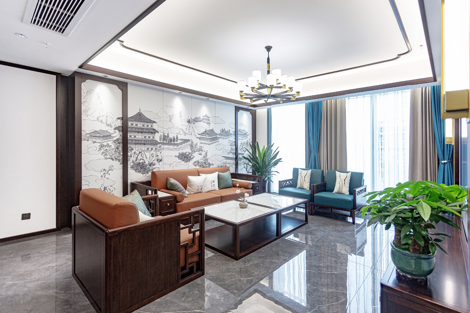 沙发布局为典型的中式围合式布局,沙发背景墙将传统水墨画与传统木饰纹相结合,配合中式木家具,古韵满满。