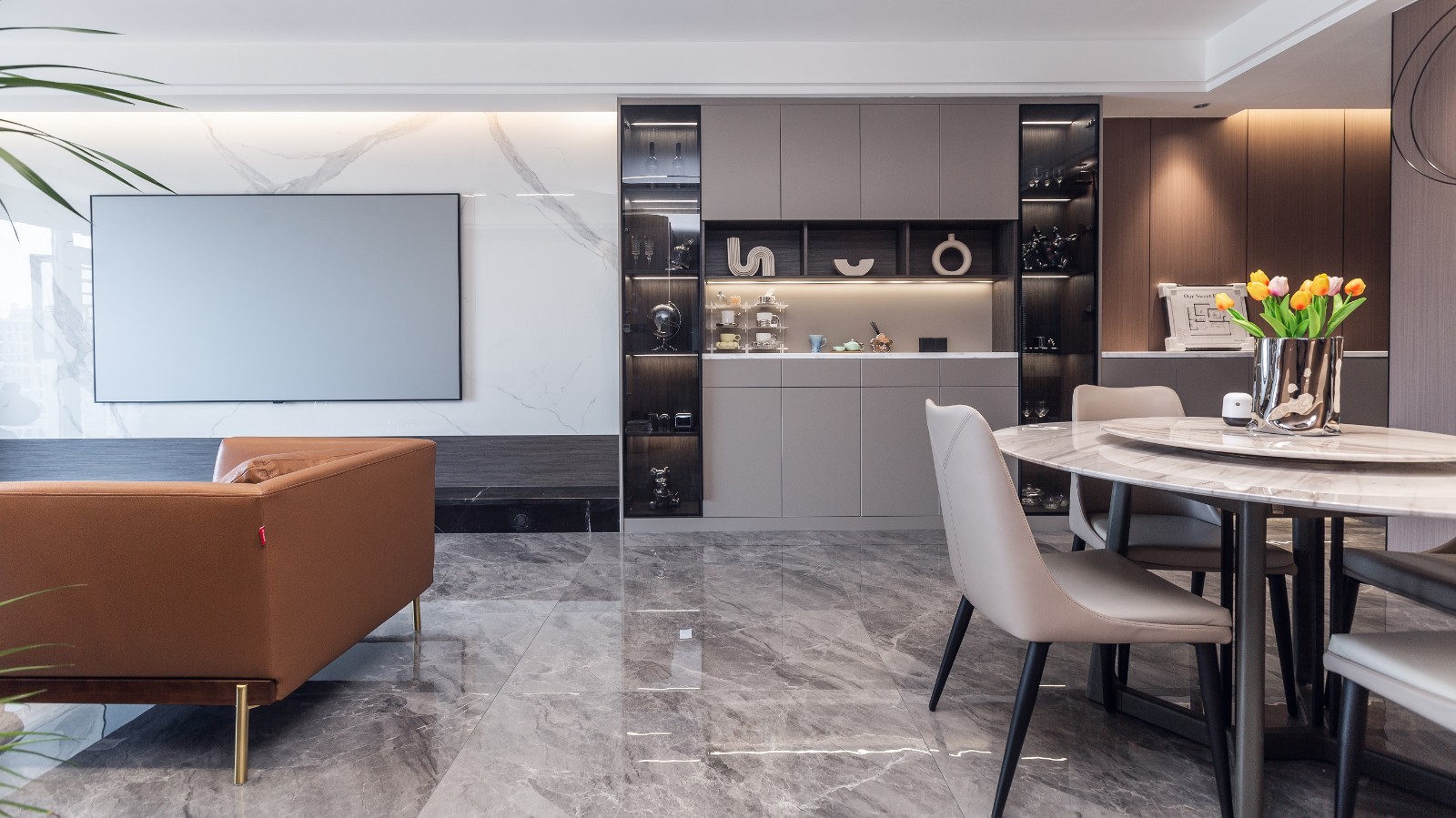 客厅的设计电视背景墙配上投影幕布,配上休闲的橙色真皮沙发,配上无主灯的设计,让客户可以在休闲居家会客和沉静式影院之间自由切换