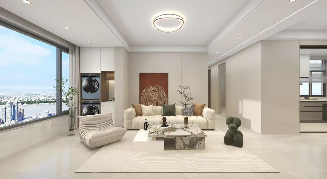 客餐厅整体比较明亮通透,阳光洒进室内,整个空间超级明亮,墙面顶面没有过多复杂造型,局部吊顶隐藏风管机,地面为米黄大理石纹地砖,与米白色的墙遥相呼应使空间纯净无暇。