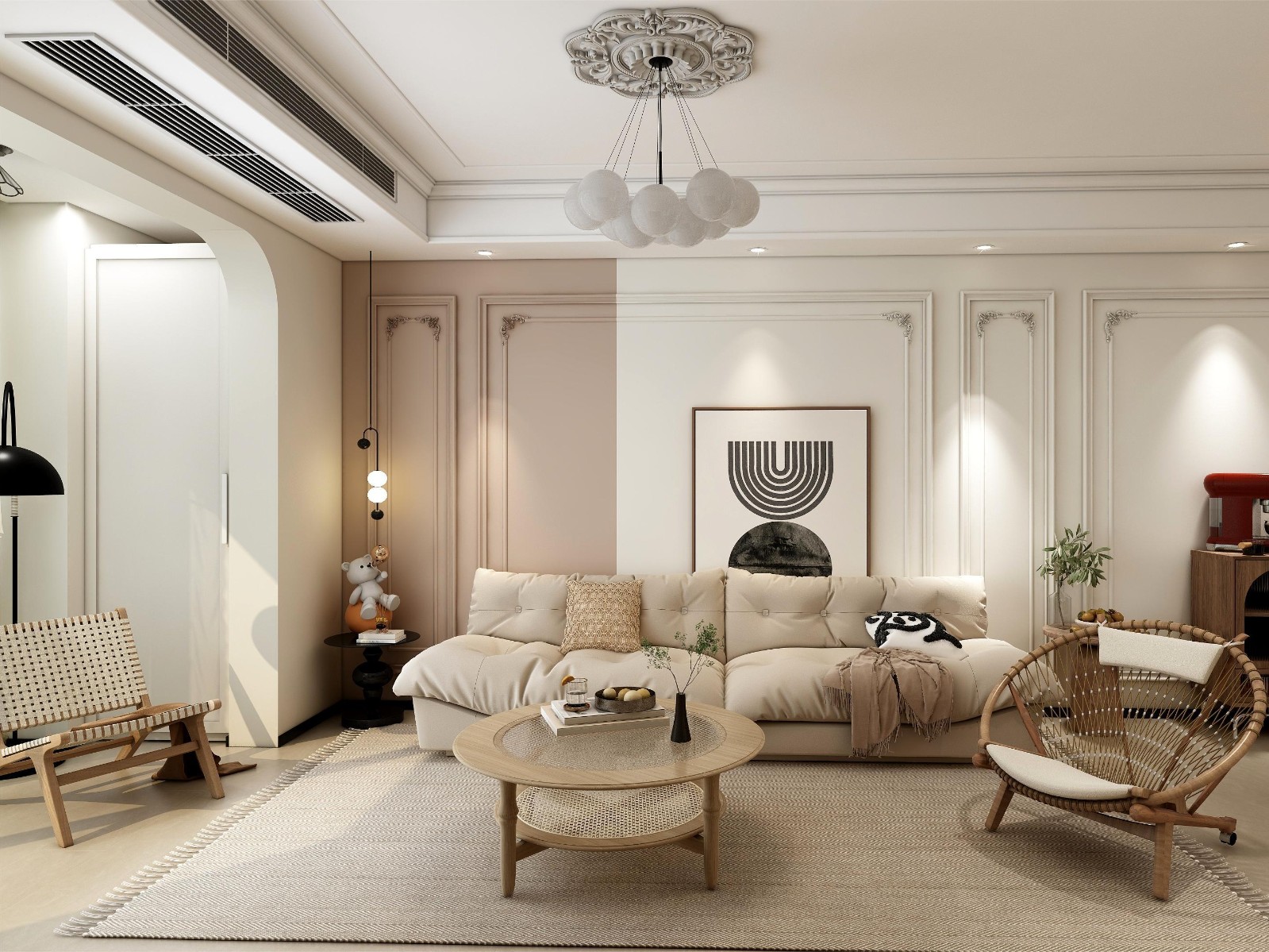 墙面使用粉色拼接奶白色 石膏线+角花塑造法式精致感