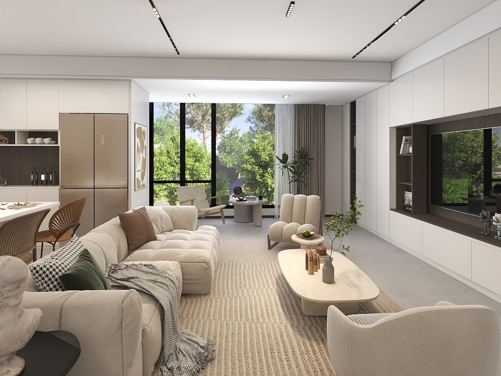 客厅与阳台连通无界,弧形线条修饰承重梁,视感和谐美观