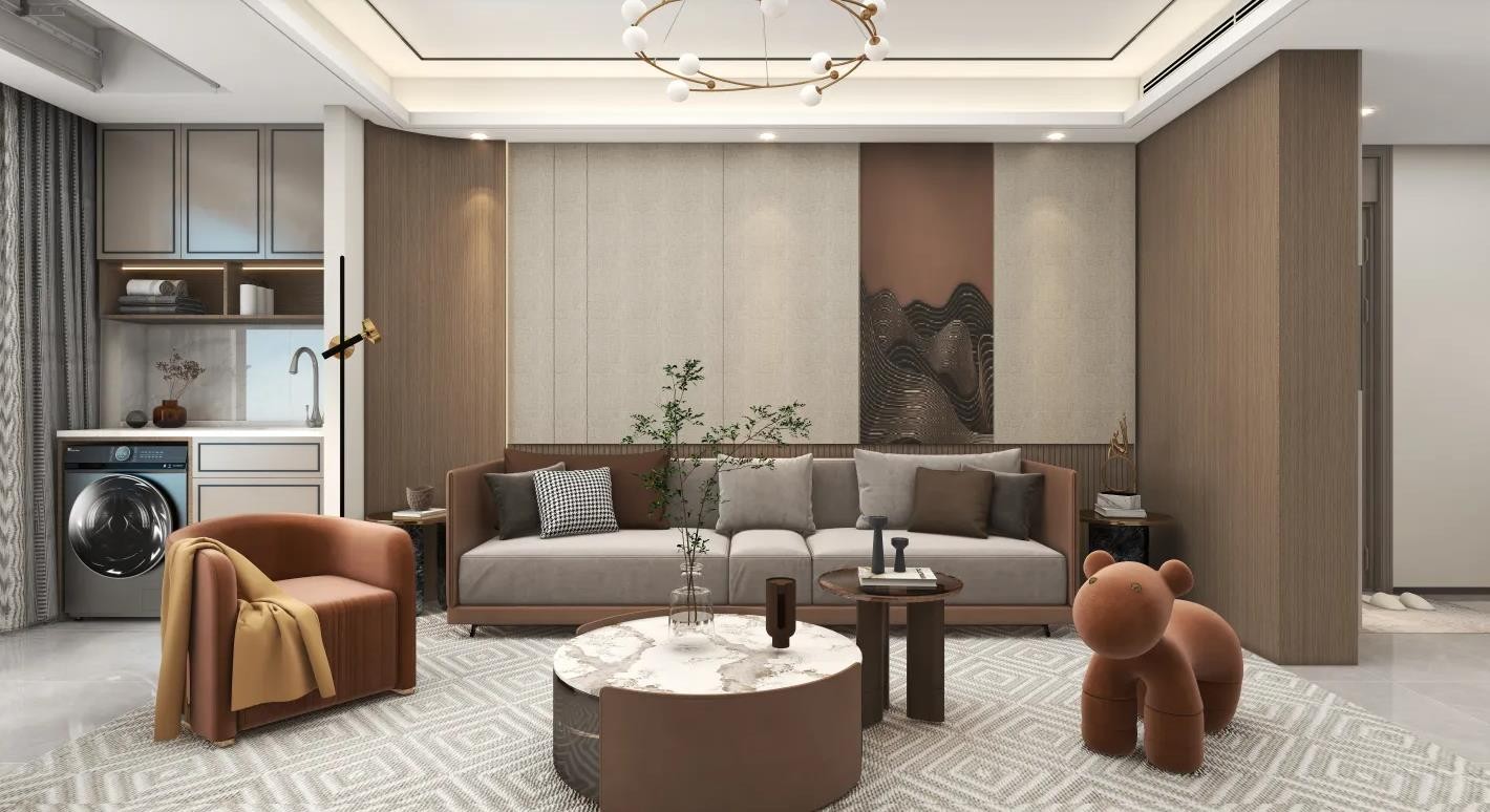 客厅整体采用符合新中式风格的色彩元素进行搭配。