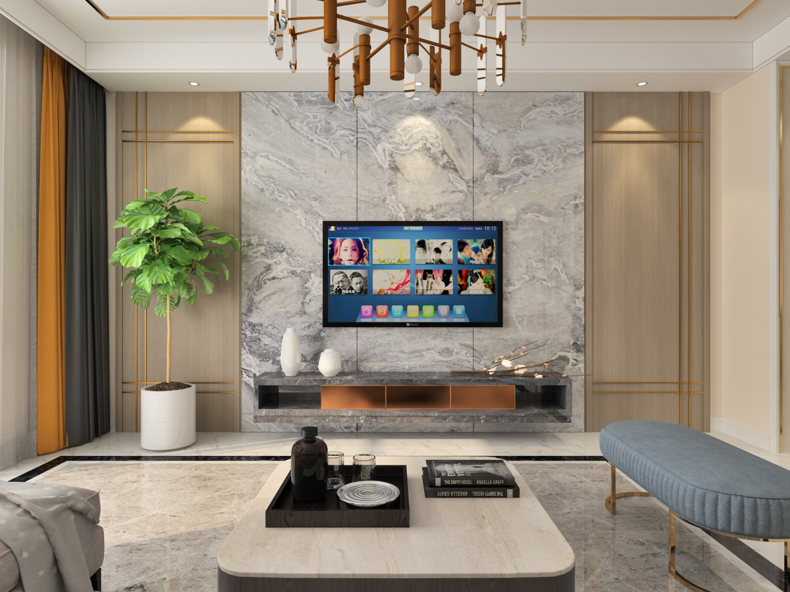 电视背景墙采用大理石护墙板及隐形门得设计 ,突出电视墙。