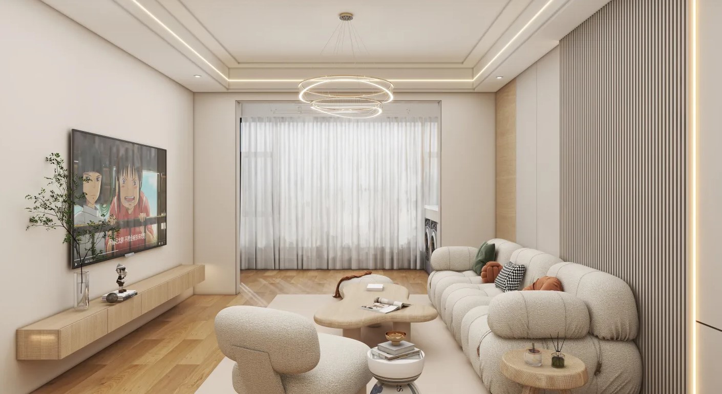 客厅用木地板搭配浅色墙漆形成原木风格。