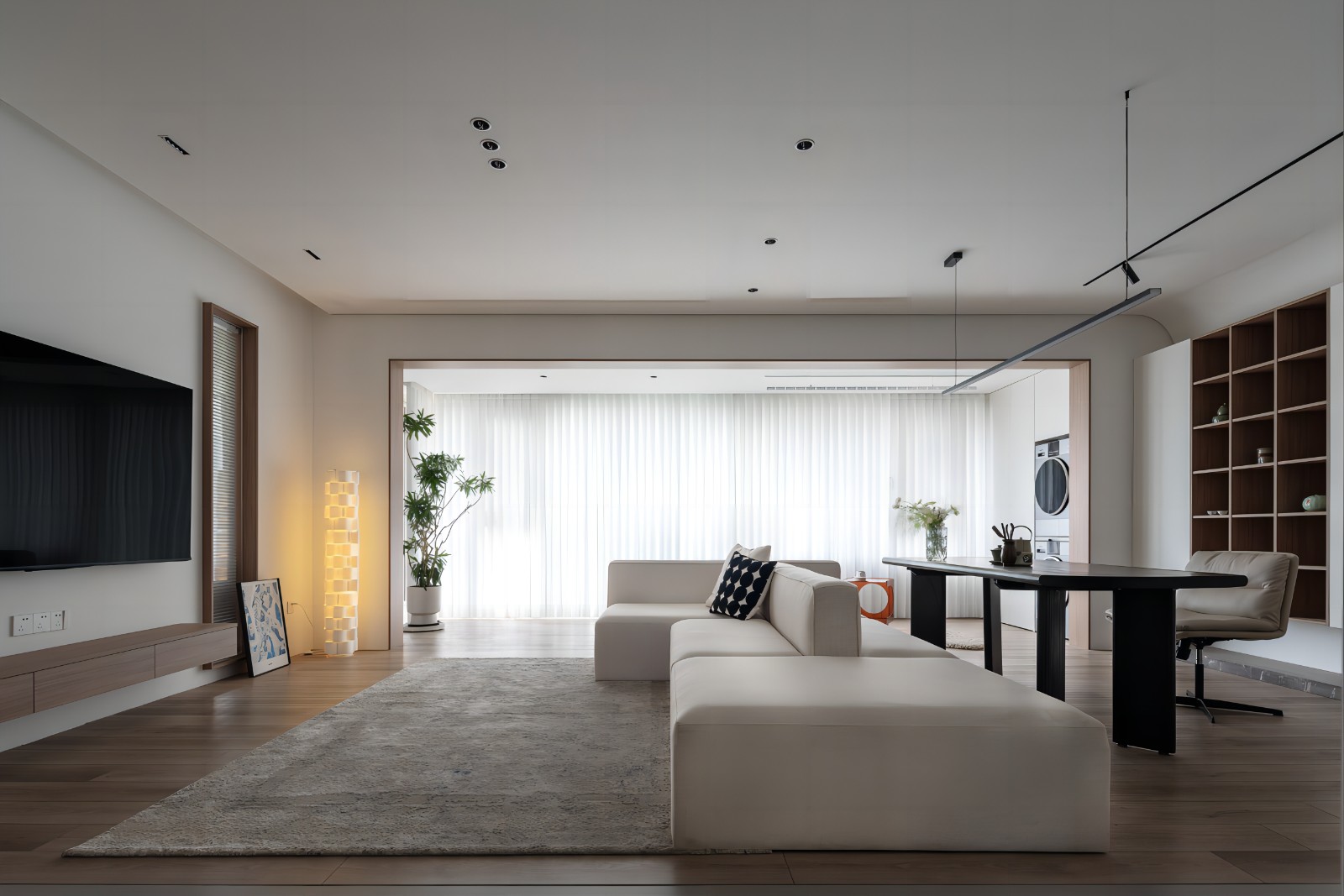 横厅打造穿透的视觉效果,用纯粹的材质和穿透的造型打造独特的空间几何,木纹的衍生感让空间形成了一道独天得厚的空间形态,穿透梦幻帘的光影宛若水帘卷洞般造型的虚实结合,材质的搭配变化让空间戛然而生一种成稳而温润的形态。