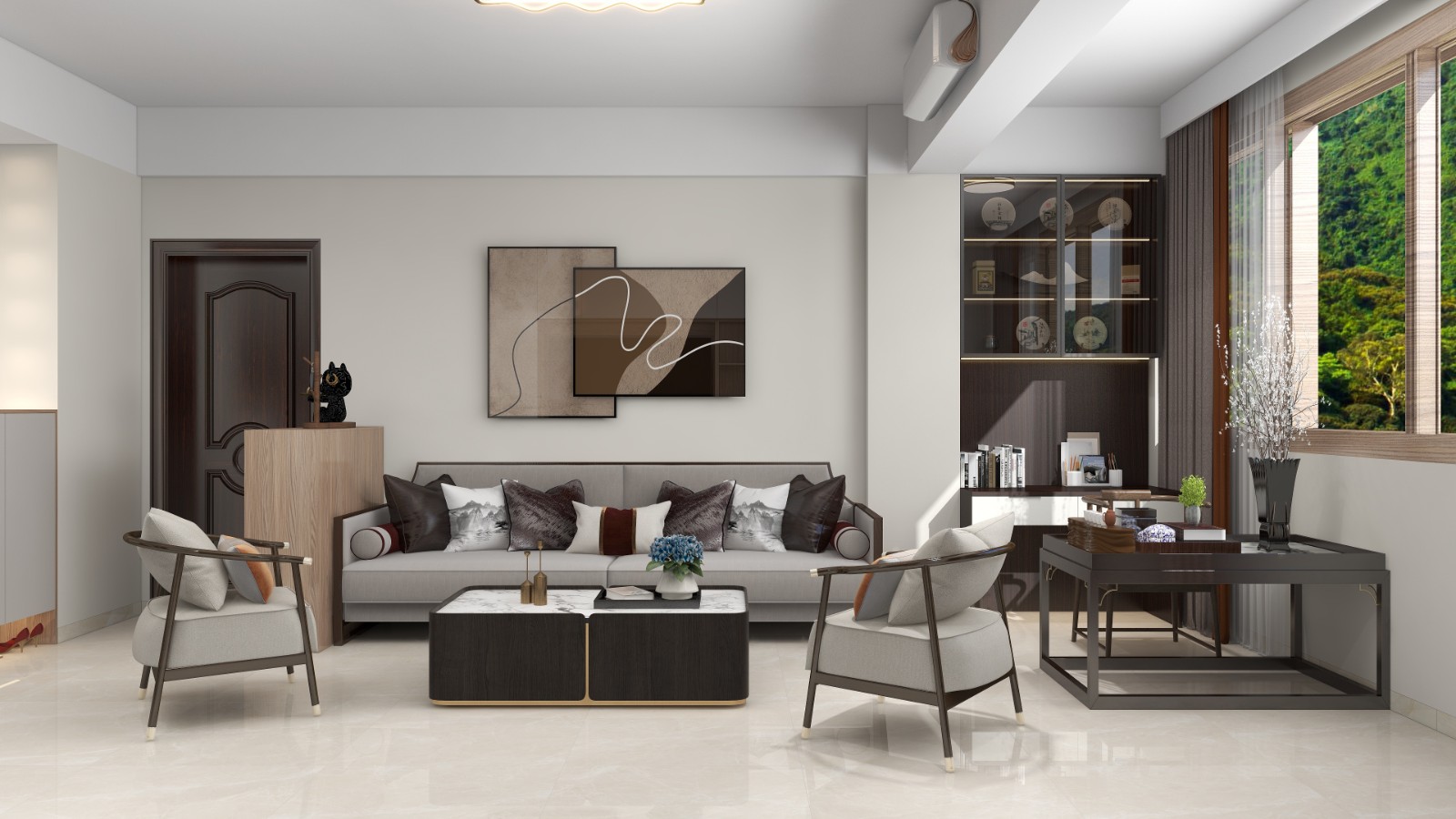 基于业主日常的生活需求,客厅设计了一个泡茶区,家具以新中式风格为主,