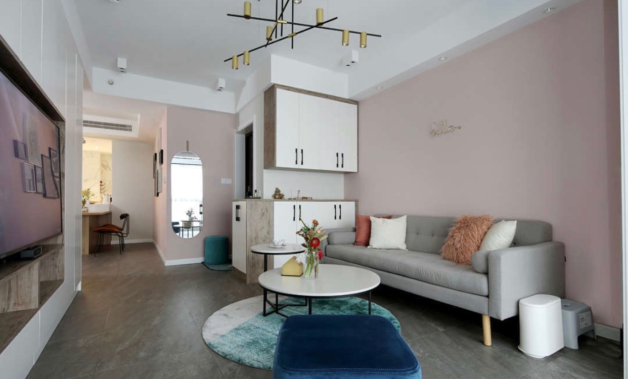 客厅延续了粉与灰的配色。给家增添一丝温暖。