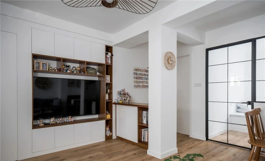 电视背景墙用白色和樱桃木色进行区域的分开,开放式的封闭设计展现了收纳的功能。不能拆的立柱和横梁增加了房子的趣味性和可读性。