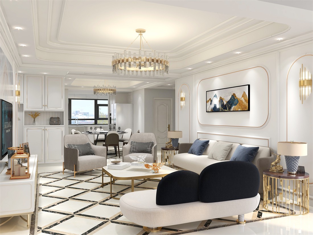 此户型是140平,北欧风格,整个空间,洁白的肌底,曲线的金属构建的柔性的图景,与装饰画形成呼应,空间整体用金属点缀。