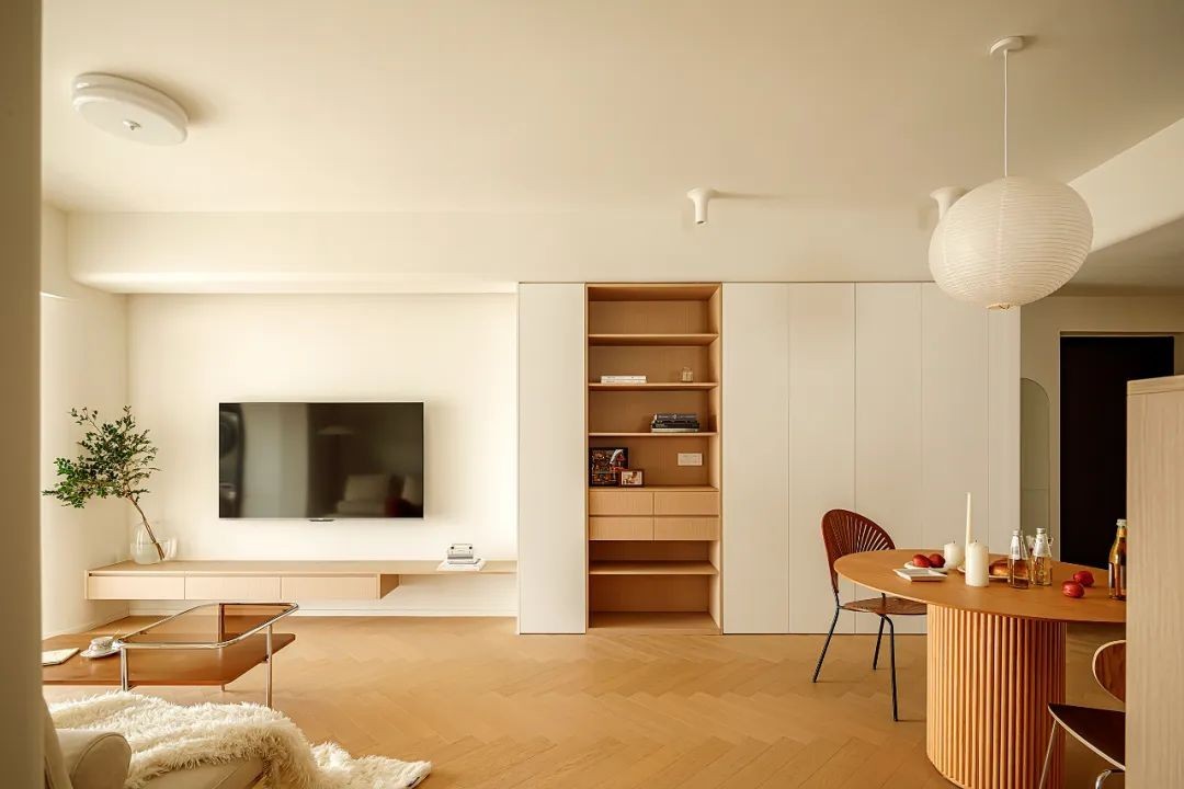 主卧延续了公区木色与纯白的设计语言,一门到顶的衣柜嵌入设计,干净利落。靠近床头处,柜子分层处置,减少拿放衣服的阻力,左侧的床头柜也可安然放置。