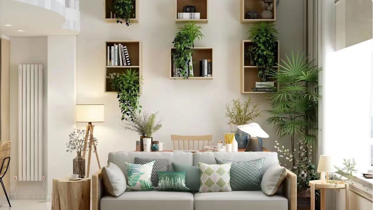 客厅用原木色架子上墙作为背景墙