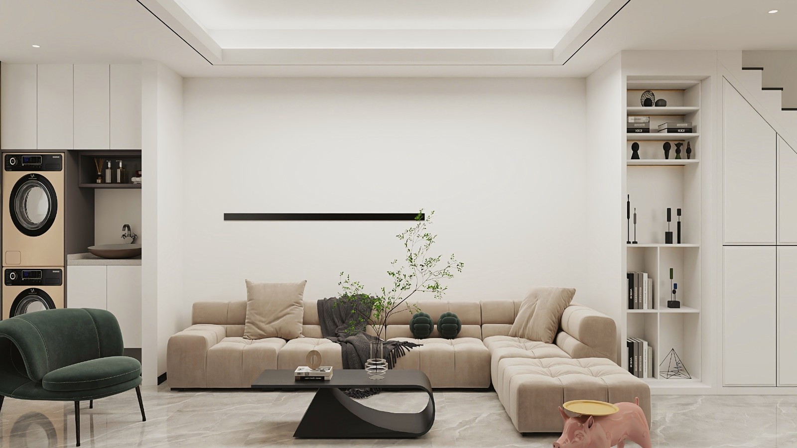 这是一间现代轻奢风格的客厅。整个空间以简洁的线条和明亮的灯光为主,营造出宽敞明亮的氛围。墙面选择米白色的墙纸,搭配灰色的石材装饰,使整个空间显得***而不失舒适感。