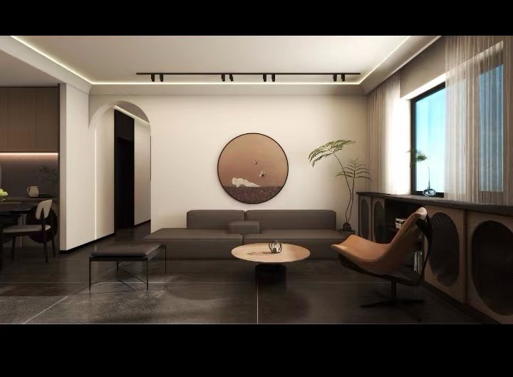 以大地色系为主基调,低饱和度的色彩治愈,在背景墙增设一列储物柜,强化客厅功能性,编织出轻柔优雅的生活情调。