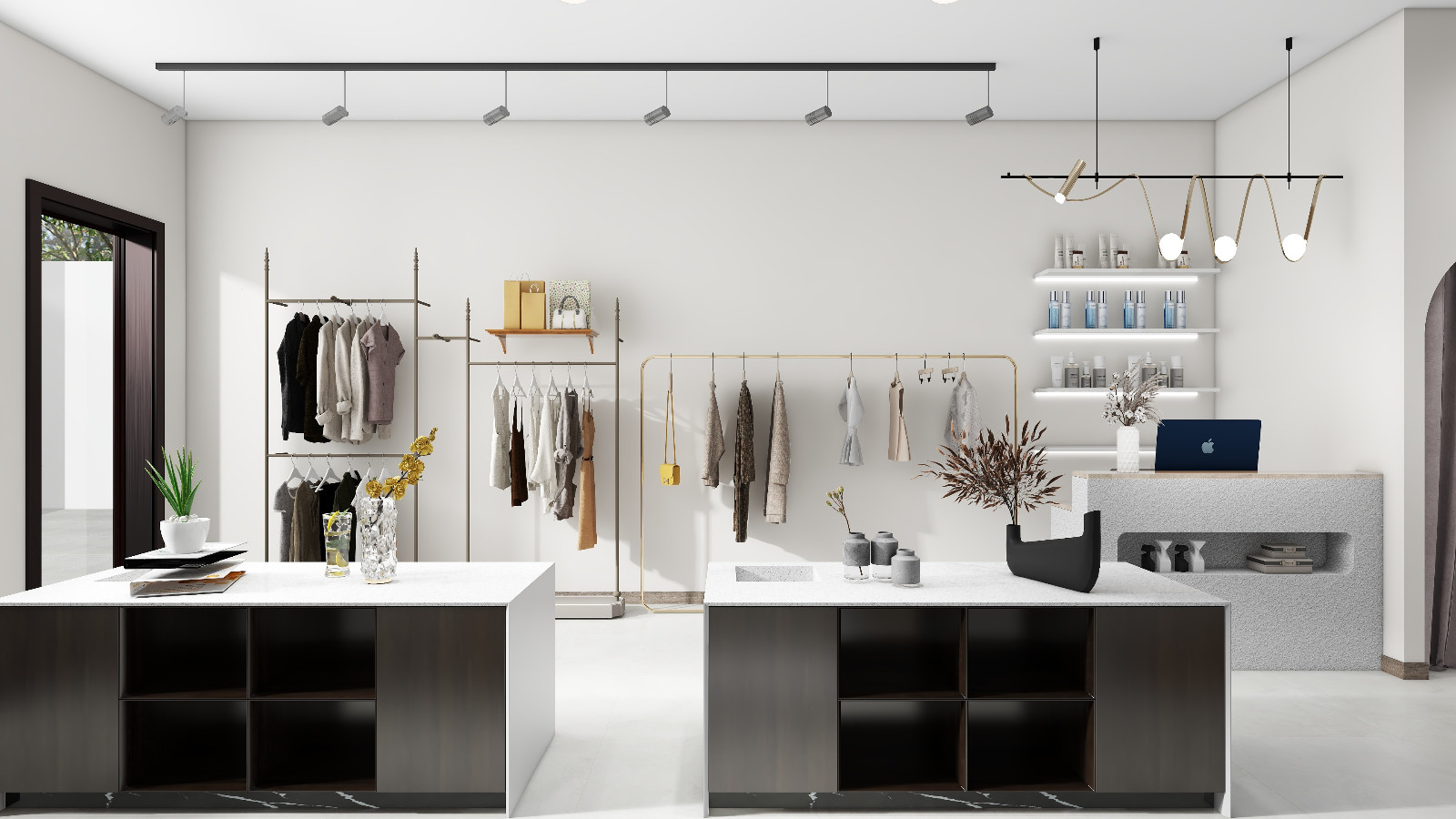 本方案整体基调是现代风格,实际使用面积40平米,设计师在设计时根据空间大小合理规划,做了橱窗、前台、休息等待区、展示架、试衣区等服装店基本布局配置,充分利用好空间的每个角落。色彩上选用白色以及邻近色等浅色系的组合搭配来打造***感,配合灯光的指引,整体简介而有序。